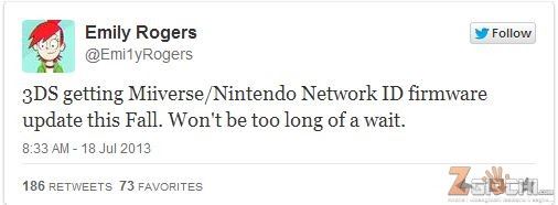 Secondo quanto riportato da Emily Rogers, redattrice di Nintendo Force, su Twitter, sembrerebbe che l’aggiornamento per 3DS dedicato ai Miiverse e al Nintendo Network dovrebbe arrivare nel periodo autunnale. Ovviamente, si tratta di una notizia non confermata, perciò restate sintonizzati su Z-Giochi per maggiori dettagli a riguardo! Di seguito, vi proponiamo il tweet di cui vi abbiamo parlato in precedenza.