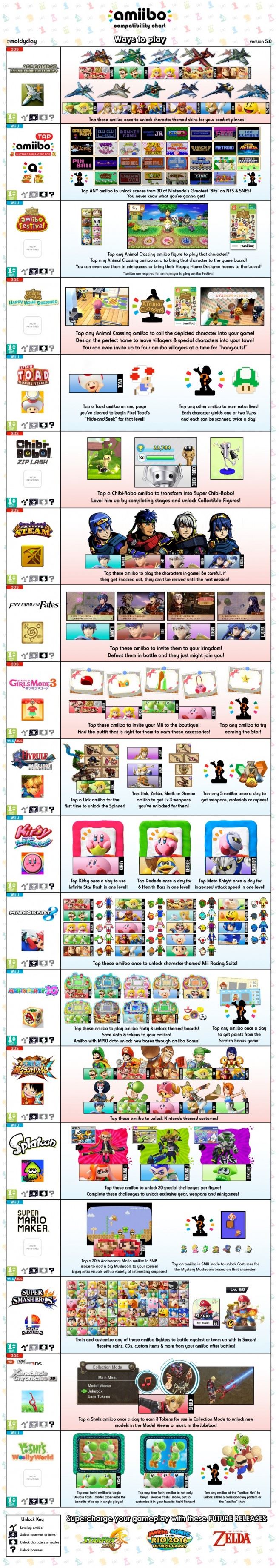 MoldyClay 64, un fan Nintendo, ha pubblicato tramite Twitter una lista di compatibilità aggiornata per quanto riguarda gli Amiibo e i giochi con i quali è possibile interagire con queste particolari statuine ispirate ai personaggi dei princiapali franchise della grande N.