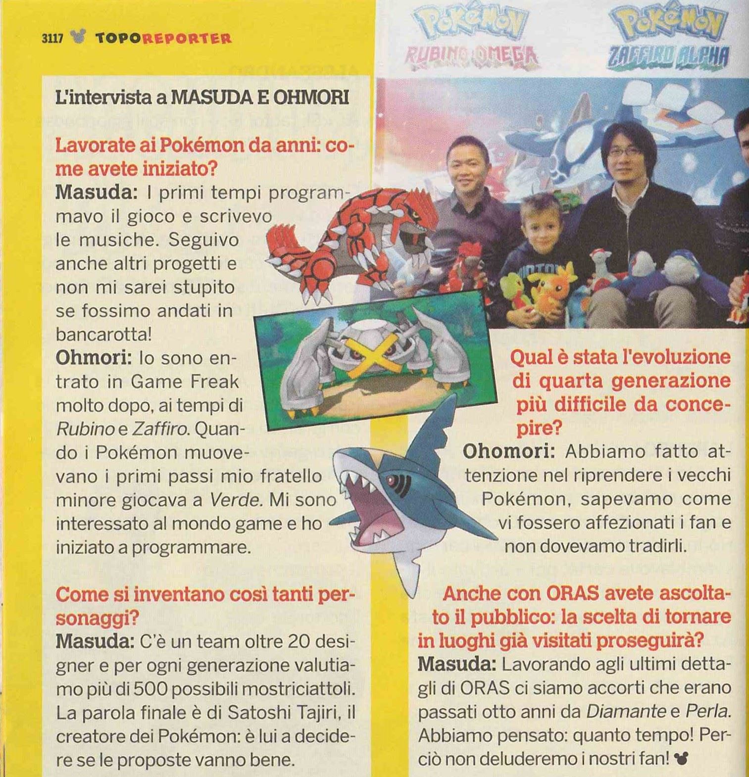 Junichi Masuda e Shigeru Ohmori sono stati raggiunti dalla redazione del settimanale Topolino dove hanno avuto modo di parlare di Pokémon e di ciò che potrebbe attenderci in futuro per questa serie. Dopo la pubblicazione di Pokémon Zaffiro Alpha e Pokémon Rubino Omega i due membri di Game Freak si sono accorti che erano passati ben otto anni dal rilascio ufficiale di Diamante e Perla.