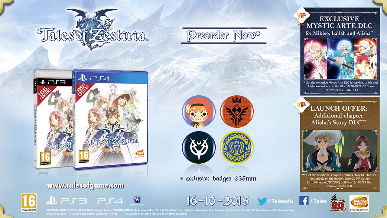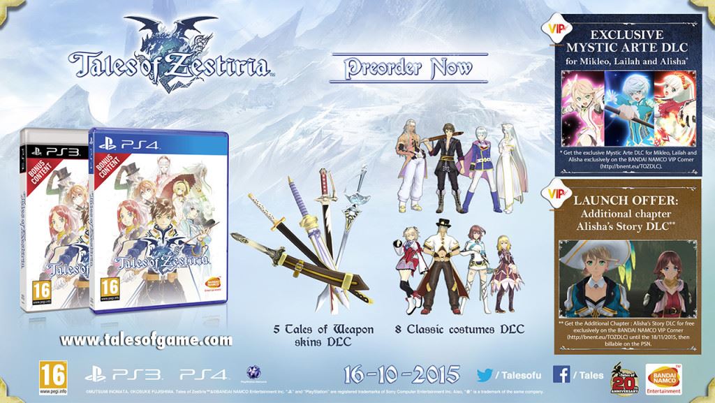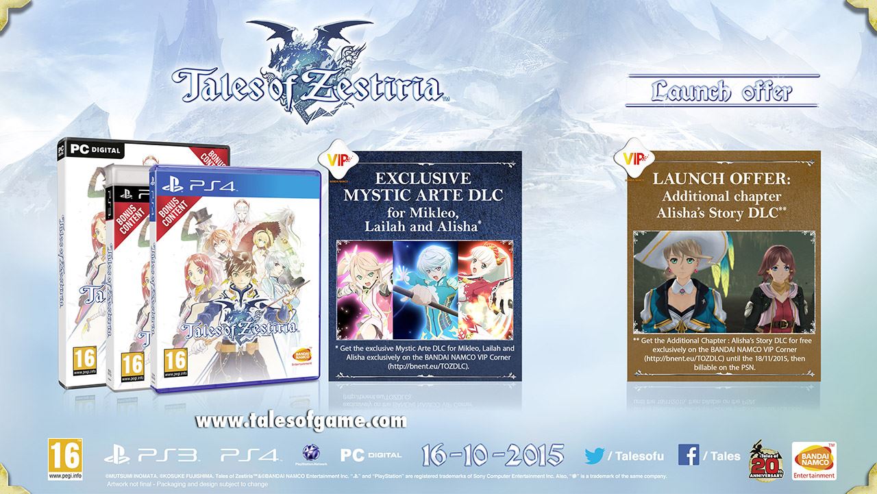 Prenotando l’edizione retail di Tales of Zestiria, sia in formato standard che da collezione, sarà possibile ottenere un DLC esclusivo intitolato Mystic Arte for Mikleo, Lailah and Alisha. Acquistando il gioco al lancio, inoltre, è comunque possibile ottenere un capitolo completamente gratuito riguardante Alisha.