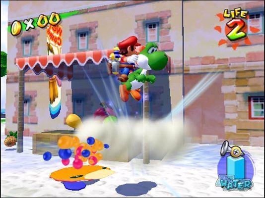 SALTA CHE TI PASSA!!!Partiamo subito dicendo che controllare Mario è un gioco da ragazzi, la maggior parte della sua grazia deriva dal suo predecessore e le mosse sono state mantenute anche qui, tra cui il turnaround estremamente utile e i salti tripli mentre tutti gli attacchi fisici sono stati sostituiti dal cannone ad acqua, chiamato Splac 3000, noto anche come FLUDD (Flash Liquidizer Ultra Dousing Service) inventato dal Professor Strambic, già conosciuto in Luigi’s Mansion, primo titolo per Gamecube uscito sul mercato. Con lo Splac 3000 Mario acquisisce nuove mosse, potendolo utilizzare per fluttuare in aria, spruzzare acqua, spiccare salti altissimi, con la versione razzo o correre molto velocemente con la versione turbo, mentre alla fine ci verrà data anche la possibilità di fare un giro sul compagno dinosauro di Mario, Yoshi, ma purtroppo si ha proprio l’impressione che questa feature sia stata implementata di fretta e furia sul finire dello sviluppo, comunque, Yoshi risulta utile solo per la sua capacità di sputare uno strano succo di frutta e a sua volta il dinosauro verrà utilizzato per un solo puzzle e una manciata di quest facoltative, inoltre l’area di gioco è grande e ben dettagliata e ha rotte diverse per i diversi obiettivi, per impedirci di dover spendere qualsiasi grave perdita di tempo nello spostamento da un posto all’altro.