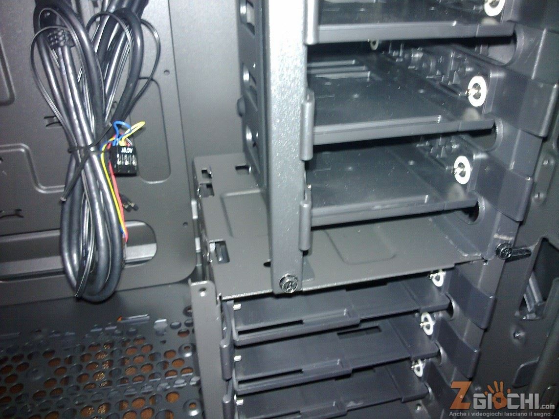 Sul fronte troviamo invece quattro slot 2.5 e tre slot 3.5, tutti Tool-less e con la particolarità di essere adattabili, si possono infatti aprire o stringere per ospitare formati differenti e vengono raffreddati da una ventola in immissione di 200mm. Va sottolineato che i dispositivi di archiviazione si possono posizionare solo con il fronte rivolto sulla parte destra del case, e non verso l’interno, garantendo così la miglior circolazione dell’aria e un maggiore ordine, ampliato anche dai vari spazi per far passare in sordina i grovigli di cavi. Come se non bastassero gli slot disponibili il case può ospitare anche atipiche collocazioni per dispositivi 2.5, come sul retro della Scheda Madre o sul fondo interno. Per quanto riguarda invece le schede video abbiamo sette slot (più uno perpendicolare) ed una lunghezza massima garantita di 43 cm. Non mancano infine i buchi posteriori per i tubi dei Liquid Cooler ed il filtro anti-polvere sulla parte bassa interna.