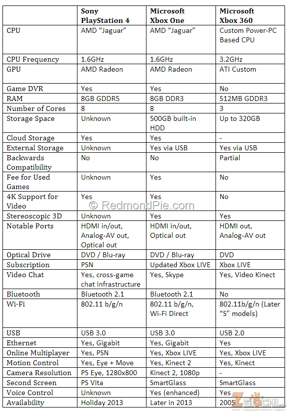 HARDWARE E PREZZOSe ne sono lette di tutti i colori negli ultimi mesi sui componenti interni di Xbox One e Ps4 ma ciò che ci è dato sapere con dettagliata certezza è solo che si tratta di due configurazioni praticamente identiche, se non per piccoli dettagli che pongono la console Sony sul gradino più alto. La GDDR5 di Ps4 è la ram che viene attualmente usata nelle schede video per PC, la sua caratteristica è l’elevatissima velocità e di rimando un’ampia banda su cui far scorrere i dati. Nelle soluzioni APU con memoria condivisa e nel caso di una architettura come Xbox One la scheda video si trova a lavorare con una ram DDR3, ben al di sotto degli standard odierni raggiunti dalle GDDR5, e se per il processore non vi sono sostanziali vantaggi è nel rendering grafico che il gap di banda potrebbe fare la differenza in futuro. Il colosso di Redmond ne era però consapevole e proprio per questo ha adottato una soluzione simile a quella dell’ Xbox 360, applicando una memoria EsRam da 32MB direttamente on-chip. La ram di tipo statico gode di diversi vantaggi rispetto a quella dinamica e se utilizzata come frame-buffer potrebbe limitare il collo di bottiglia dovuto alla DDR3 unificata. I rumors più recenti parlavano però di problemi di surriscaldamento che hanno obbligato Microsoft ad un’imprevista diminuzione del clock della Vga con conseguente perdita di potenza bruta, i famosi Floating Points alla base dei calcoli vettoriali, già nativamente a favore della scheda video di Ps4, fortunatamente non si è fatta attendere la smentita di Major Nelson che riapre le scommesse su quale delle due soluzioni sarà la più efficace. Si tratta in entrambi i casi di Architetture a basso consumo, perfette per le consoles, ed allo stesso tempo molto performanti ma sopratutto semplici da programmare. Vi allego qui sotto un’immagine di confronto sui dati tecnici ad oggi ufficializzati:
